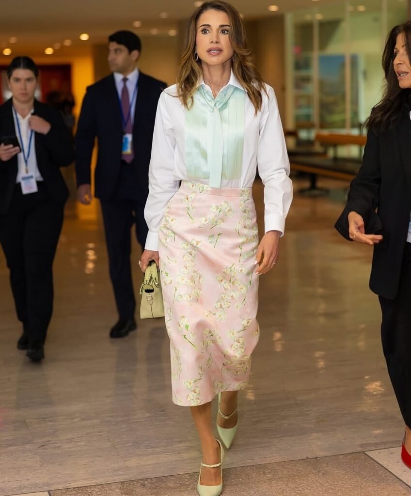 وخلال الحدث، خطفت الملكة الأنظار بإطلالة أنيقة بألوان الباستيل، حيث تألقت بقميص أبيض بتفاصيل أنثوية ناعمة، نسّقته مع تنورة وردية مطبعة بالأزهار، وحقيبة وحذاء باللون الأخضر الفاتح، في إطلالة جمعت بين الرقيّ والأنوثة، حملت توقيع علامات عالمية مثل Sebline وEmilia Wickstead وFendi وJennifer Chamandi.