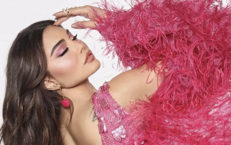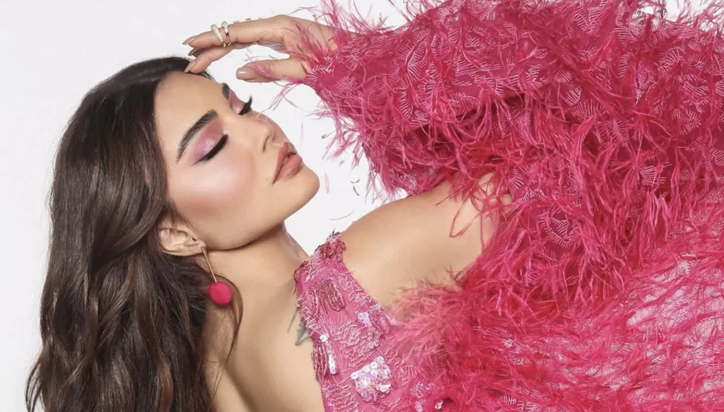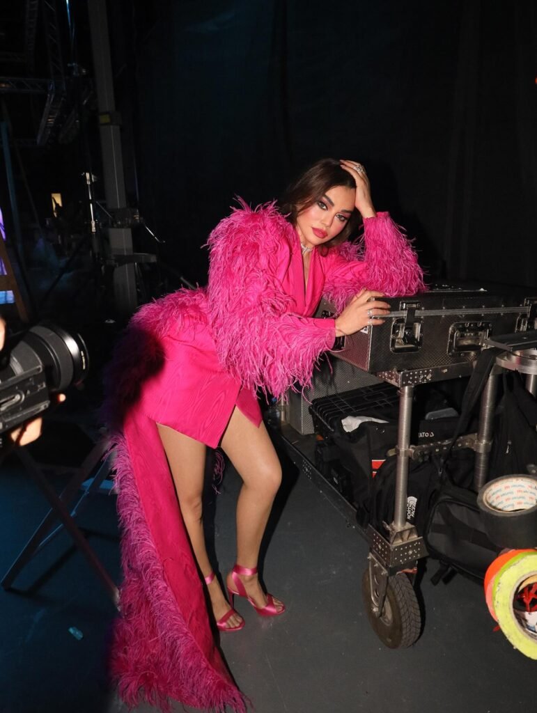 جاءت الإطلالة الأولى بفستان قصير مكشوف الظهر بنمط بليزر مزين بريش فاخر، جمع بين الجرأة والأنوثة، بينما الثانية كانت “جمبسوت” مرصع بالترتر مع رداء كتفين من الريش، ما أضفى لمسة من الفخامة والجرأة الهوليوودية.