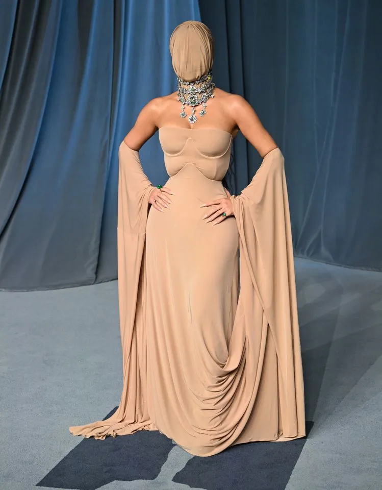 ظهرت نجمة تلفزيون الواقع كيم كارداشيان، البالغة من العمر 44 عامًا، بإطلالة صادمة على السجّادة الحمراء لحفل Academy Museum Gala في لوس أنجلوس حيث ارتدت فستانًا من دار Maison Margiela بلون النيود، مع كورسيه ضيّق وأكمام متصلة بحافة التنورة، ما خلق شكلًا يشبه جناحي الخفاش عند رفع يديها. وما زاد غرابة الإطلالة هو القناع الحُرّ الذي غطّى رأسها بالكامل، ما أثار تساؤلات الجمهور: هل هي فعلاً كيم خلف القناع أم شخص آخر؟