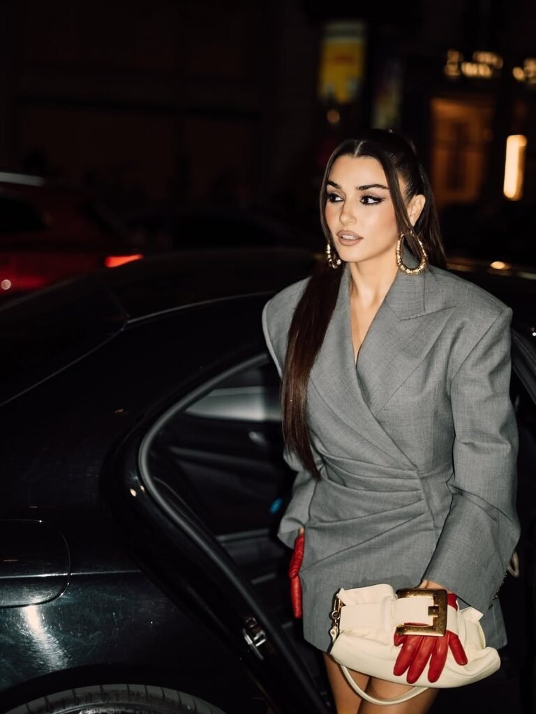 هاندا أرتشيل اختارت فستان بليزر قصير باللون الأسود، مزوّد بياقة هندسية بارزة، ونسّقته مع قفازات حمراء جلدية وحذاء بلون مماثل، لتضيف لمسة درامية قوية على إطلالتها، مع أقراط ذهبية ضخمة وحقيبة من توقيع الدار.